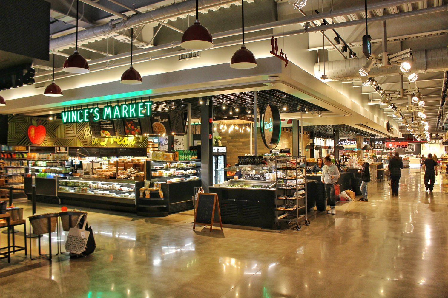 - Design elements will invoke a farmer’s market or food hall atmosphere