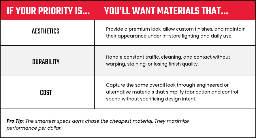 Choosing the right materials for your retail fixtures comes down to balancing three factors: